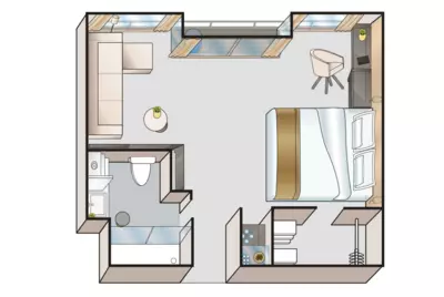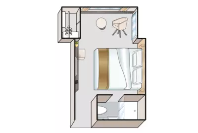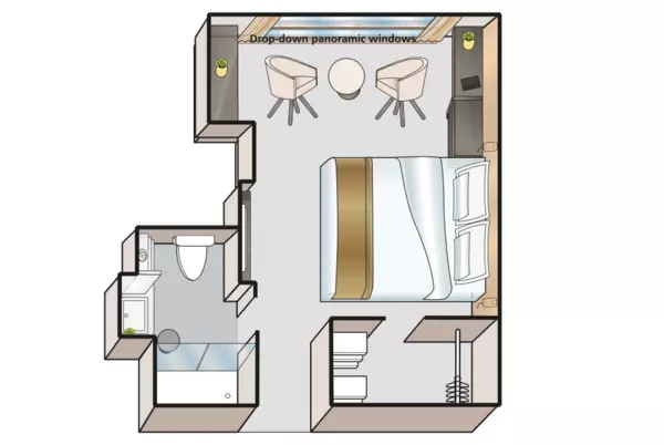 Each cabin features a spacious bathroom with a walk-in shower, luxurious Rituals bath products, and a hair dryer, along with a fixed panoramic window that fills the space with natural light. Thoughtful touches like a comfortable double or twin bed, generously-sized wardrobe, secure in-room safe, flat-screen TV, individual climate control, well-stocked minibar and direct dial telephone ensure a restful and well-equipped stay.