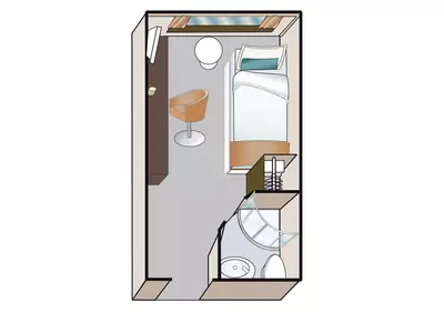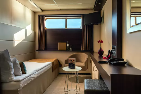 Each cabin includes a spacious bathroom with shower, premium Rituals® bathing products, and a hair dryer, along with a fixed panoramic window that welcomes natural light. Thoughtful details such as a comfortable single bed, practical storage space, secure in-room safe, flat-screen TV, individual climate control, and direct-dial telephone ensure you enjoy both convenience and relaxation throughout your stay.