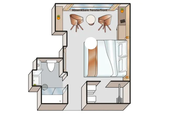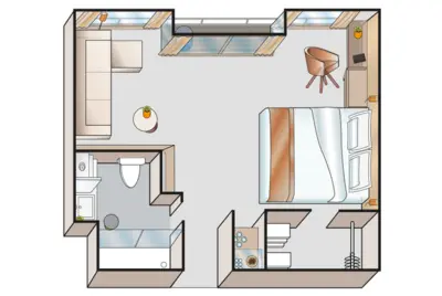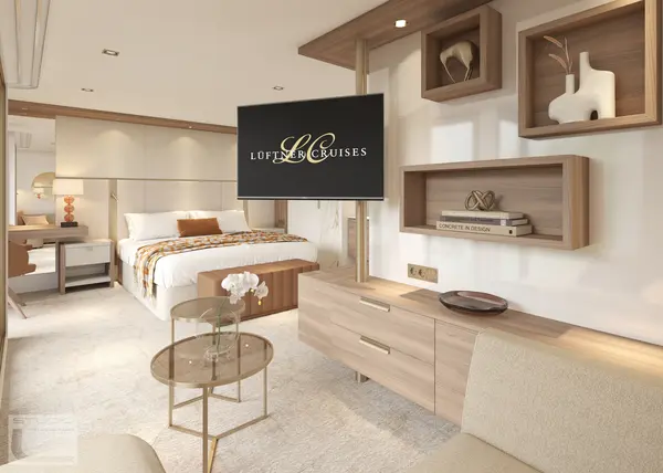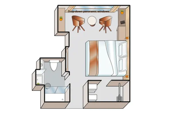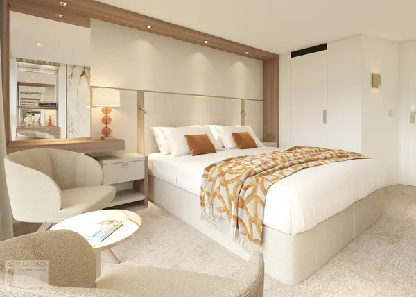 Each cabin features a spacious bathroom with a walk-in shower, luxurious Rituals bath products, and a hair dryer, along with a fixed panoramic window that fills the space with natural light. Thoughtful touches like a comfortable double or twin bed, generously-sized wardrobe, secure in-room safe, flat-screen TV, individual climate control, and direct dial telephone ensure a restful and well-equipped stay.