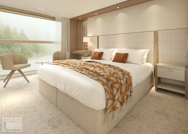 These staterooms feature the AMADEUS Signature Bed (available as a double or twin), a drop-down panoramic window for uninterrupted river views, a spacious bathroom with a walk-in shower and premium Rituals® bathing products, walk-in wardrobe, flat-screen TV, individual climate control, well-stocked minibar, in-room safe, bathrobe and slippers, hair dryer, and direct dial telephone — ensuring a comfortable and refined travel experience.